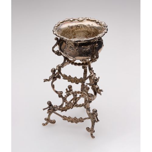 Repousse bowl on tiered stand adorned with putti (foreign marks on bowl)