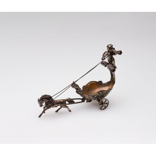 Having a horse pulling a chariot with turning wheels driven by a cherub blowing a horn
