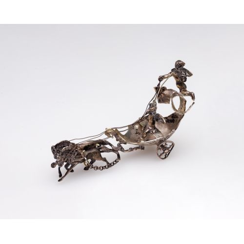 Having two cherubs driving two horses pulling a chariot having wheels that turn