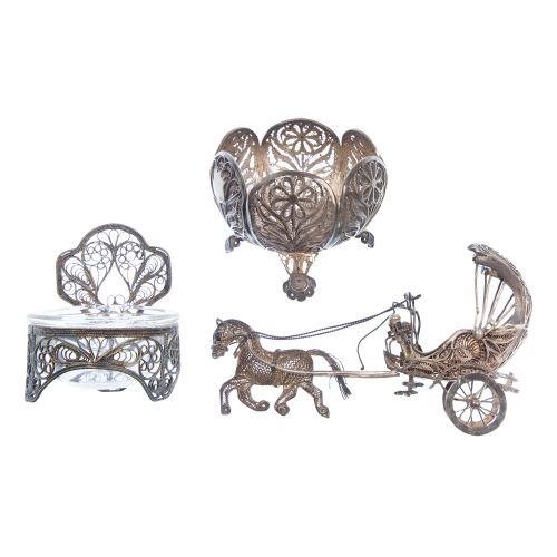 (3) items of different sizes and styles including a horse drawn carriage and one with an insert (unmarked 0.925)