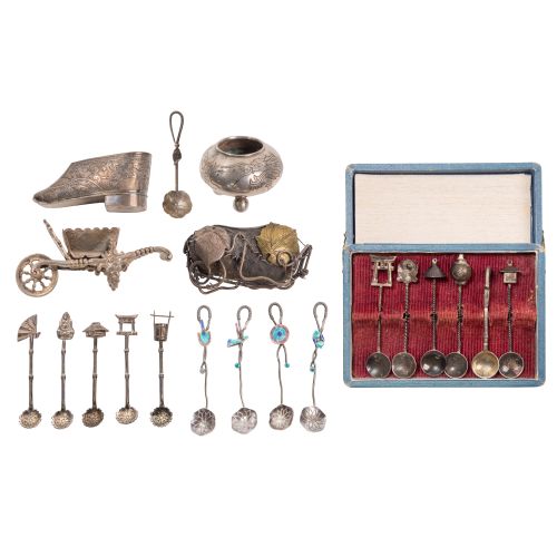 (21) items including (4) salt cellars, (2) boxed sets of spoons, (5) loose spoons (unmarked 0.975, one having maker mark "SF" for Sing Fat, most having Chinese characters)