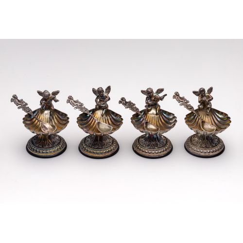 In the style of Pedro Duran, a set of (4) salt cellars in shell-form, each with a cherub playing a musical instrument (guitar, violin, accordion and drum) on black plastic base having spoons (marked "925")