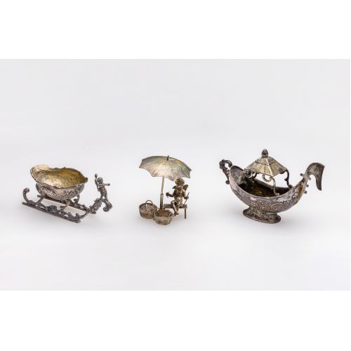 (3) items including a cherub, a sleigh and a boat (marked "800", unmarked 0.875)