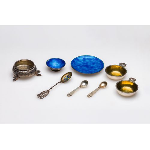 (8) total items including (4) open cellars of various shapes sizes and material as well as (3) spoons and an enamel saucer (marked "sterling" / "925")