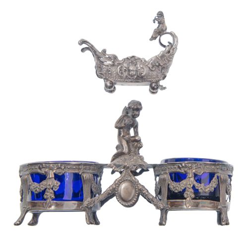 (2) items including a double open cellar having a cherub on top and blue glass inserts, having a "Potosi" silver mark and a Persian style cellar shaped like a boat having an illegible mark (both unmarked 925)