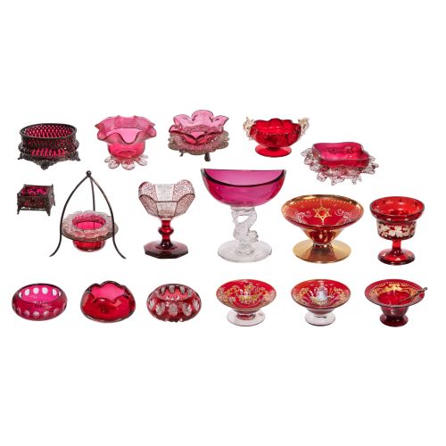 (17) items of various shapes, sizes, hues and materials including Moser style, English ruffles, cut-to-clear and Murano, one having spoon