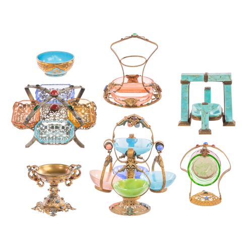 (7) items of various shapes, sizes and materials, including some glass, jeweled, gilt and brass holders, intaglio glass open cellars, some having gilt