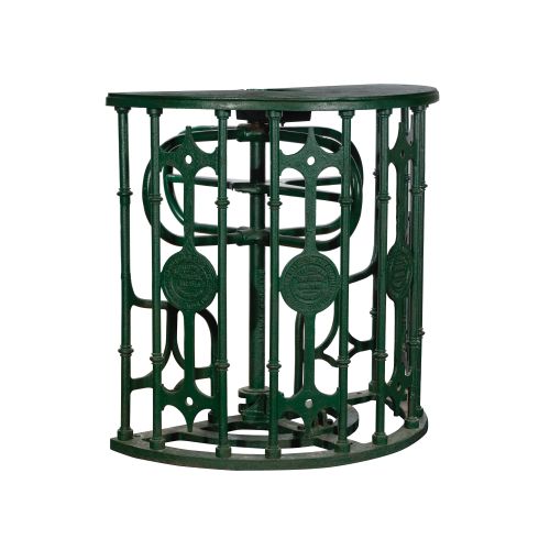 Painted green, designed with a rotating barrier that allows one person to pass through at a time, a demilune top having a tally counter, original stamped "W. T. Ellison Rush Control" signage around cage; together with Riverview tickets and memorabilia