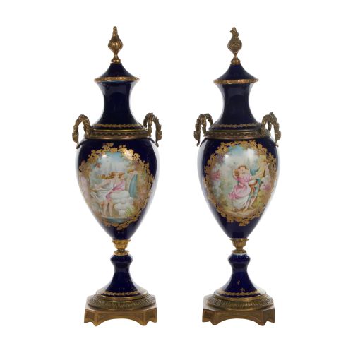 A pair of cobalt lidded urns, having gilt, oval portraits, gilt embellished tops, brass handles and finials, stepped pedestal base, wreathed foot, spurious Sevres marking on foot of base