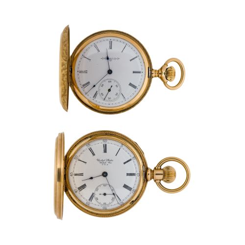 (2) items including an Elgin serial #8264008 dating to c.1900, 15-jewel movement, No.220 grade, white dial having Roman numerals, blue hands, subsidiary dial for seconds, stem wind, stem set (marked "Roy U.S. Assay 14k" inside case) and a United States Watch Co. serial #724651 dating to c.1903, No.105 grade, white dial having Roman numerals, blue hands, subsidiary dial for seconds, stem wind, lever set (marked "Warranted 14k U.S. Assay" inside case)