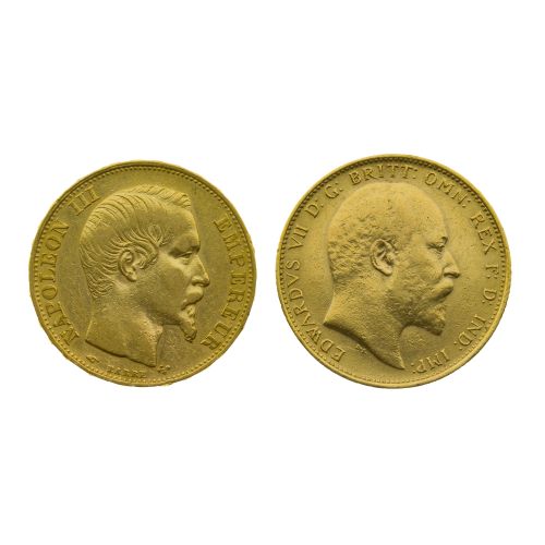 Lot #405: 1857 French Gold 20 Franc and 1905 English Gold Sovereign