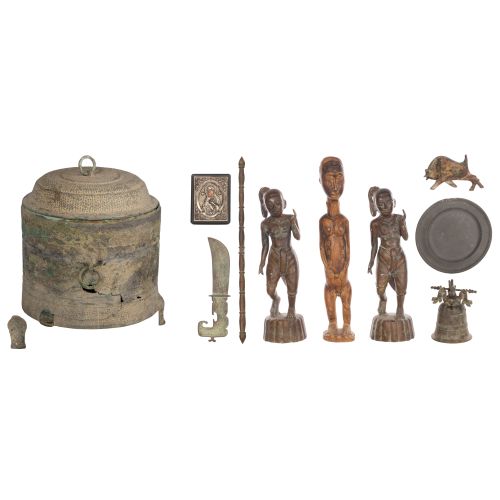 (10) items including a Han Dynasty Style Bronze Lian cylindrical tripod covered vessel having a raised pebble texture exterior surface throughout, loose ring handles suspended from taotie masks at sides, the lid also having a ring handle, accompanied by illustrated sales documents from Senatus Consulto, Copenhagen, Denmark as well as (2) figures, a bull, a knife, a bell, a pointed rod and a plate; together with a wood figure and religious icon