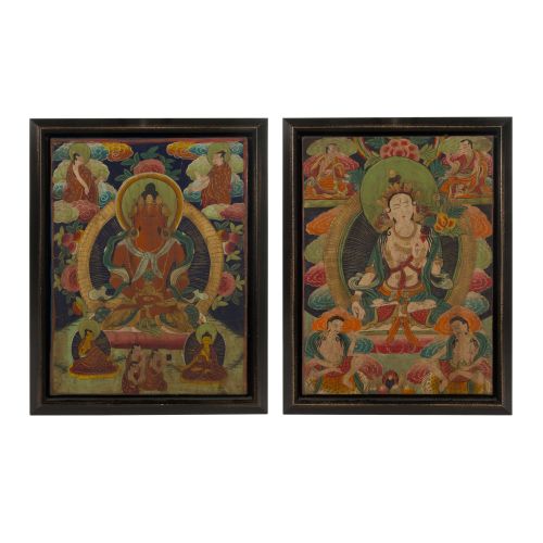 (2) items including a White Tara Buddha and an Amitrayus Buddha, both painted in distemper on cotton, both float mounted in wood display frames