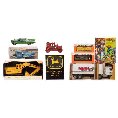 (9) items including a "John Deer Excavator" by Ertl in original box, a stone John Deere plaque, a cast iron red fire wagon, a Japanese model having original box, a Superman and a Superboy Aurora plastic models in original boxes, (2) Lionel train cars #16726 and #19805 in original boxes and an Ertl metal "Pamida Transtar Truck and Trailer" in original box
