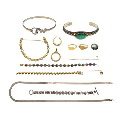 (13) items including (4) bracelets, a pendant bezel and a single hoop style earring (most marked "14k"), (2) youth rings (marked "10k") as well as bracelets and necklaces (most marked "925") and a mystic topaz gemstone