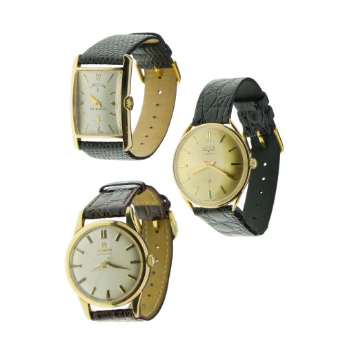 (3) items including a Vulcan having a gold-tone dial and automatic wind (case marked "18k"), a Lord Elgin tank style and an Omega (cases marked "14k"), all having leather bands