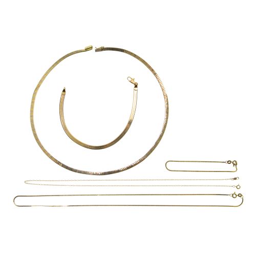 (5) items including a tri-color box style chain necklace 0.25-inch wide, (2) chain style necklaces, (3) chain style bracelets (all marked "14k" / "585")