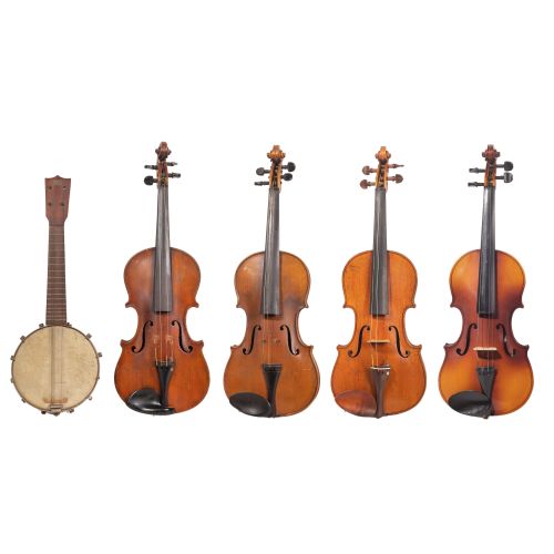 (5) total items including a labeled "Carlo Micelli 1922" by German maker Karl Meisel, having figured maple back and sides, spruce top and ebony tuners, chin rest and tailpiece; together with a labeled "Anton Breton / 1994 Model AB 10 4/4" and bow and (2) unlabeled violins, all in hard cases, as well as a banjolele / ukulele banjo labeled "First Hawaiian Conservatory of Music" on head stock