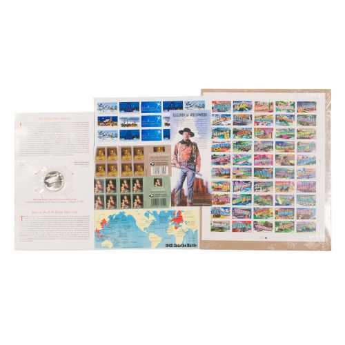 Approximately (40) items including (20) full and partial booklets and sheets of unused US postage stamps, mostly Forever Stamps but including 20c, 34c and 37c commemoratives, (8) covers including official mail, (5) "Legends of Hollywood" and other pictorial promotion cards, a bag of loose stamps, used and unused, (2) Marshall Islands Flying Tiger $5 coins on info cards, (2) tokens