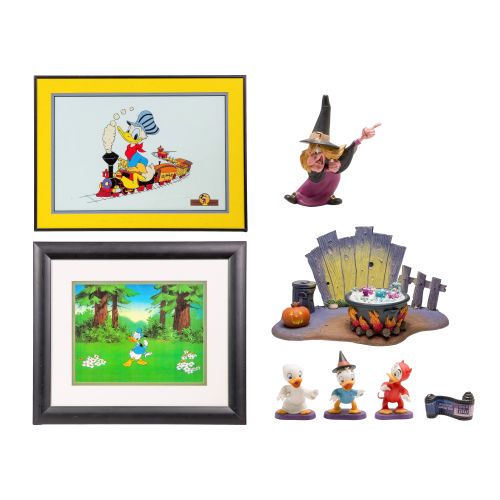 (8) items including a set of (6) Trick or Treat porcelain items including "Lil Witch", "Lil Spook", "Lil Devil", "Brewing Up Trouble", a title plague and a base, most having boxes and COAs, a Donald Duck in the woods serigraph and a print of Donald duck as a train conductor from the short "Out of Scale", both matted under acrylic in wood and metallic frames