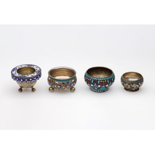 (4) items including a cloisonne rim ball footed (marked "CK" / "84"), a tapered flat bottom (marked "L.H"/ "84"), a ball footed turned lip (marked illegibly / "94") and a tapered flat bottom (marked "G.C" / "84")