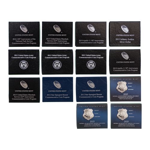 (14) coins including: (2) Star-Spangled Banner, Infantry Soldier, (2) US Marshals Service, Law Enforcement, (2) Apollo 11, National Park Service, US Army, having original packaging