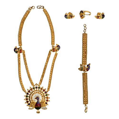 A 4-piece suite including a necklace, pierced earrings, an adjustable ring and a bracelet, all having a multi colored enamel peacock motif, in red presentation box (marked "22/20c")