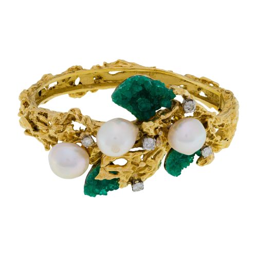 Lot #239: 18k Yellow Gold, Pearl, Emerald and Diamond Hinged Bangle Bracelet