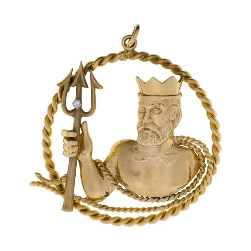 Neptune in a twisted circle, trident adorned by a round cut diamond (marked "14k")