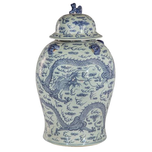 Unmarked underglaze blue dragon and clouds decorated jar having four taotie mask handles on shoulder and a foo lion finial on lid