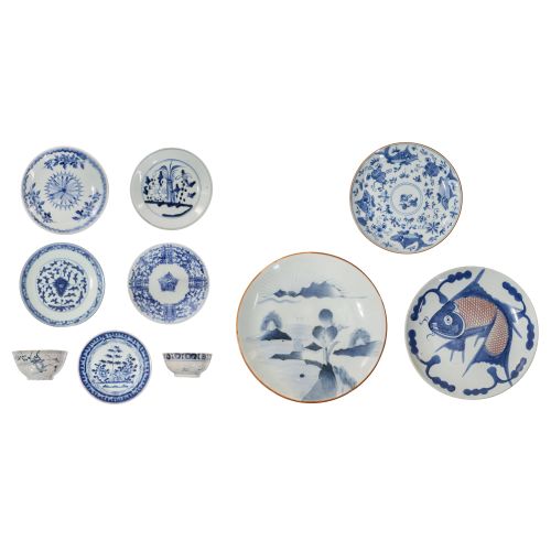 (10) items, export items to Southeast Asia including (2) bowls having various patterns and (5) plates, three having underglaze blue marks underside as well as a Chinese underglaze blue decorated fish and floral motif, a Chinese underglaze blue and iron brown fish and a Japanese Arita / blue Imari depicting a sun and clouds behind wooded islands, all unmarked