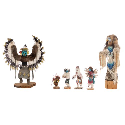 (6) items including an Alta Apachito Eagle kachina, 20th century, marker signed to underside, depicting an eagle figure with fur and feathers, on a wood base as well as a Bear Byem, a Crow Mother by L. Yazzie, a Fancy Dance by T. G. Beinlly, an unknown dancer and an eagle masked figure, a few artist signed