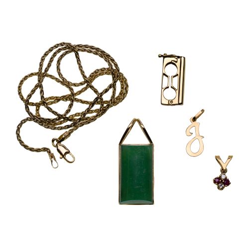 (5) items including (3) pendants with one having jadeite jade, a beaded necklace holder and a necklace (most marked "14k")