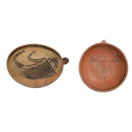 (2) total items including a polychrome painted ceramic bowl having loop form handle; together with a Hopi / Tewa Sikyatki unsigned revival burnished pottery bowl having a single pierced lug handle, worn black painted decoration on interior