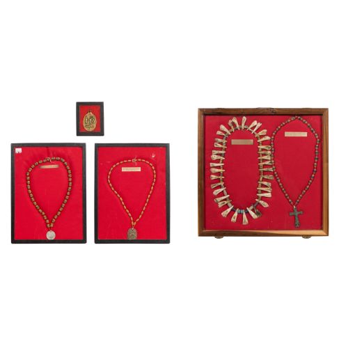 (5) total items including a 1768 beaver emblem oval on trade bead necklace and a stylized beaver oval having "HB" hallmark, a Northern Plains Sioux style buffalo tooth and a French Indian fur trade brass Jesuit Friendship cross, contained within a lined wood and glass display cases; together with a copy of an 1804 Liberty half dollar on a string of glass frit trade beads, including frames / display cases