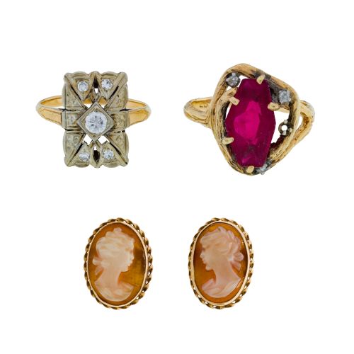 (3) items including a ring having free-form ruby adorned by diamonds, a bi-color Art Deco ring having round cut diamonds and a pair of screw-back carved shell cameo earrings (all marked "14k")