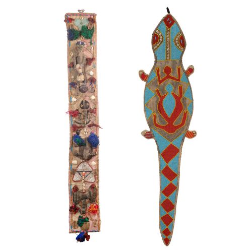 (2) items including a beaded panel having 3-dimensional decoration on a cotton fabric, adornments including cowrie shell panels, glass beads, animal shells, yarn and seed pods as well as a wall hanging multi-color beadwork having cowrie shell attachments on pieced fabric substrate, beaded hanging loop