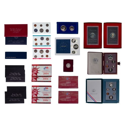 Including (10) silver proof sets, (2) special mint sets, 1969 mint set, (2) Eisenhower $1 brown boxes, Eisenhower $1 blue pack, Bicentennial proof and uncirculated set, Prestige set and (2) silver commemoratives