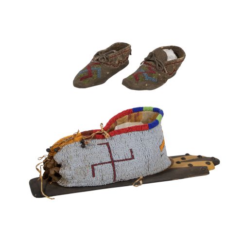Lot #680: Native American Whirling Log Toy Cradleboard and Moccasins