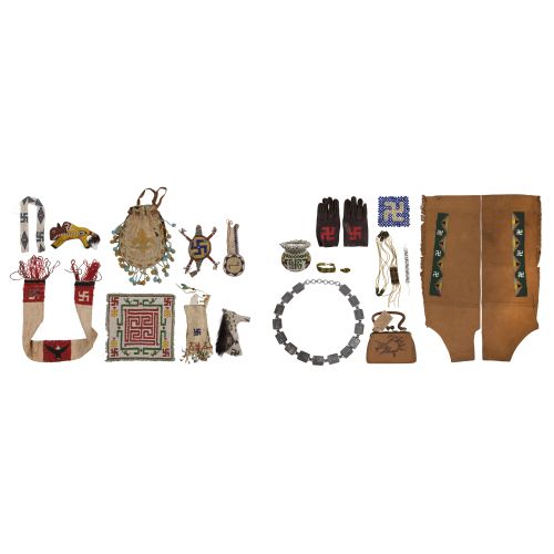 (19) total items including (3) animal fetishes, a pocket watch case, a pouch, a tobacco bag, a necklace, coaster, a beaded textile having eagle motif, a pair of brown chaps, a pair of leather gloves, a purse and (6) beaded items including a coaster, vase, bracelets, necklace and ring; together with a metal Native American belt