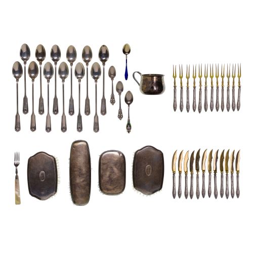 (46) items including (12) iced tea spoons, (4) children's spoons, a child's cup, (4) hair brushes (most marked "sterling" / "925") and gold dipped appetizer utensils (weighted 0.800 silver)