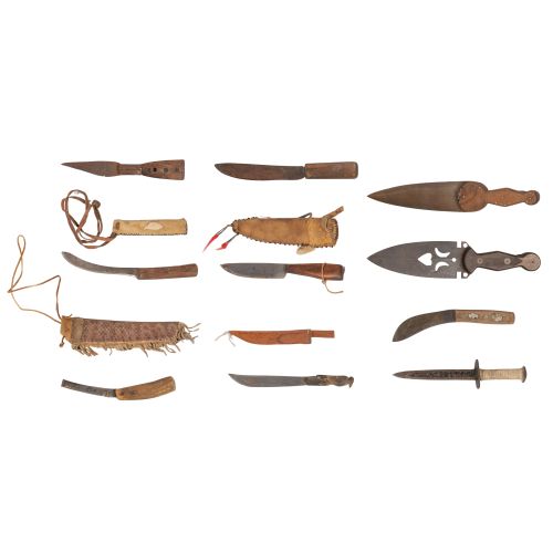 (11) items in various shapes, sizes, materials and motifs including a Sioux Ghost knife, dags, trades, belt dagger, skinning, some having sheaths
