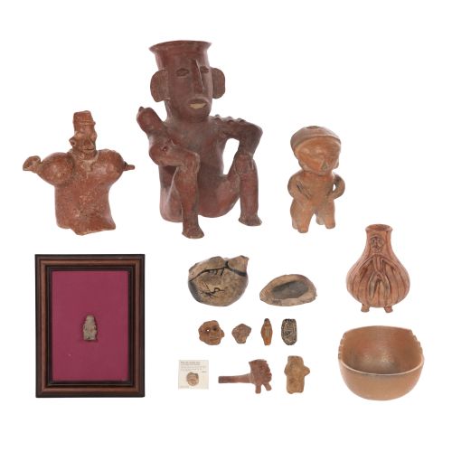 (15) items including Pre-Columbian style figures, fragments, pipes, paint bowls and beads of various materials, sizes and shapes as well as a pre-Columbian style Central American terra-cotta footed vessel having applied figure and a round, earth-toned ceramic micaceous clay bowl having a stepped rim and incised signature
