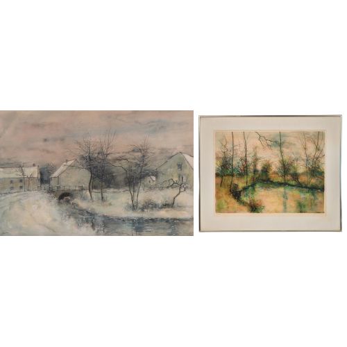 (2) undated items, including a signed lower left, "Vieux Pont et riviere en Neige" depicting a snowscape of a bridge over a river, under acrylic in a gilt wood frame having linen liner, Wally Findlay Galleries and a bill of sale dated 1982 as well as a lithograph, signed in pencil lower right margin, "e.a. 16/25" lower left margin, "Autumn Sunset" depicting a landscape of trees and pond, matted under acrylic in a metal frame, Wally Findlay Galleries sticker verso