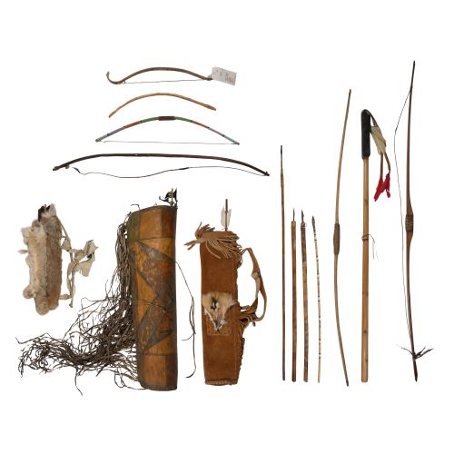 Various bows, animal hide quivers, arrows, a parfleche (suitcase) bag decorated with bold, painted geometric designs and a walking stick