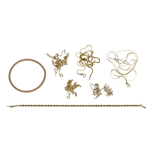 (7) items including (5) necklaces, a twisted rope bracelet and a hinged bangle bracelet (all marked "14k" / "585")