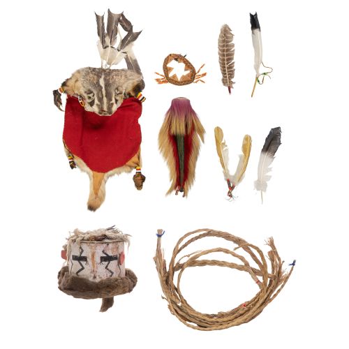 (8) items including a badger pelt headdress having attached feathers, a roach style headdress, a beaded feather set, an owl feather, (2) unknown feathers, a decorative embellished cloth collar, a woven and hide covered ceremonial headpiece and a set of twelve sweet grass smudge braids
