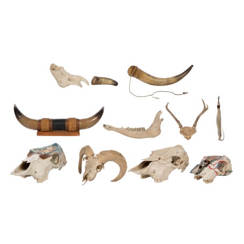 (10) items of various shapes, sizes and animals including skull, horns, a powder horn, jaw bones, some painted