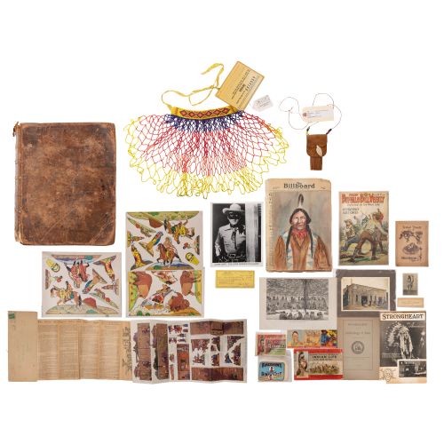 Including a Lone Ranger actor John Hart signed check and publicity photograph, 1918 Buffalo Bill Weekly magazine, a Graphic Scenes Kickapoo Indian Life booklet, (3) Indian Chewing Gum trading cards, an 1895 Academy of Sciences Archeology booklet, a sepia photograph, a Sears advertising cut-out booklet of a fort, a Skookum Apples booklet, a Strongheart playbill, photograph and clipped signature, (6) Blackhawk ginger ale labels, an etching from a book depicting the Cree, a Watson-Guptill mail circular, Plat & Monk Co. Native American themed paper cut-outs, assorted watercolor paintings and drawings of Native subjects mounted in a 1936 Billboard magazine, an early 19th century Bible; together with a 1993 Geronimo movie prop necklace having COA and a leather possibles purse