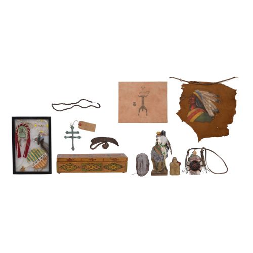 (11) total items including metal trade beads, an Ulu knife, Lakota copper trade cross, a matchstick box, a display case having various accessories, a Zapotec bottle doll, a painted screen style mask, a painted hide wall hanging, an abstract skull sculpture and a piece of painted cloth; together with a Hungarian style canteen